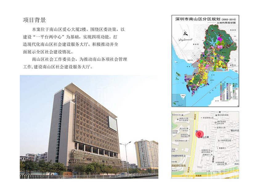 | 設(shè)計(jì)說明 | 本案位于南山區(qū)愛心大廈2樓。圍繞區(qū)委決策,以建設(shè)“一平臺兩中心”為基礎(chǔ),實(shí)現(xiàn)四項(xiàng)功能。打造現(xiàn)代化南山區(qū)社會建設(shè)服務(wù)大廳,積極推動并全面展示全區(qū)社會建設(shè)情況。 | ||||