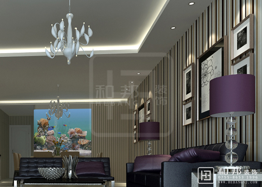 客廳的沙發墻面的線條與電視墻的墻面有著“天輕地重”的舒適視覺感,抱枕使用了紫色,與黑色沙發的相得益彰很舒適、溫和,這種裝飾效果形成對比的層次美感。