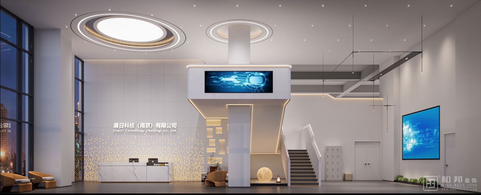 | 設(shè)計(jì)說明 | 本案以 “宇宙探索” 為脈絡(luò),頂面圓環(huán)似恒星散發(fā)能量,接待區(qū)星光點(diǎn)飾如宇宙塵埃。樓梯旁球形燈模擬月球,呼應(yīng) “晨日” 之名,將科技公司與日月星辰關(guān)聯(lián),營造充滿想象力的宇宙探索氛圍,讓空間成為連接現(xiàn)實(shí)與宇宙遐想的載體 。 | ||||