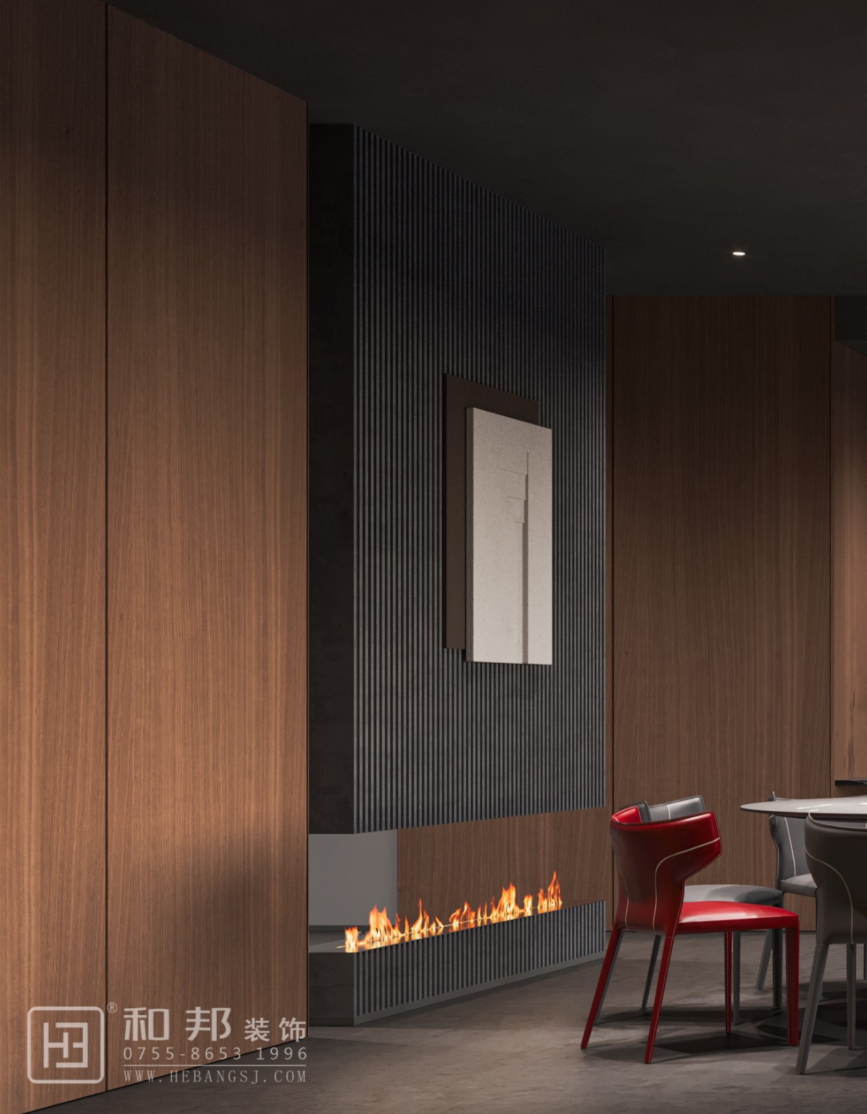 該客廳設計以現代簡約融合輕奢風格,開放式布局串聯空間。深棕、深灰為主色調,搭配木質、金屬材質,燈光營造層次,壁爐、酒柜等細節彰顯品質,打造沉穩高級的居住氛圍 。